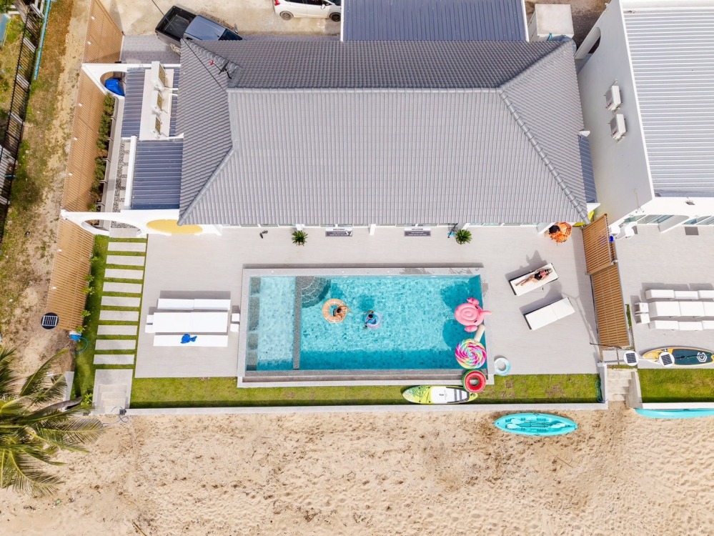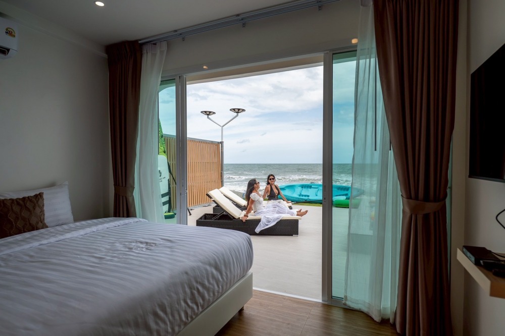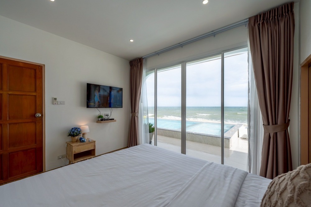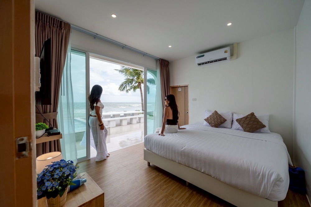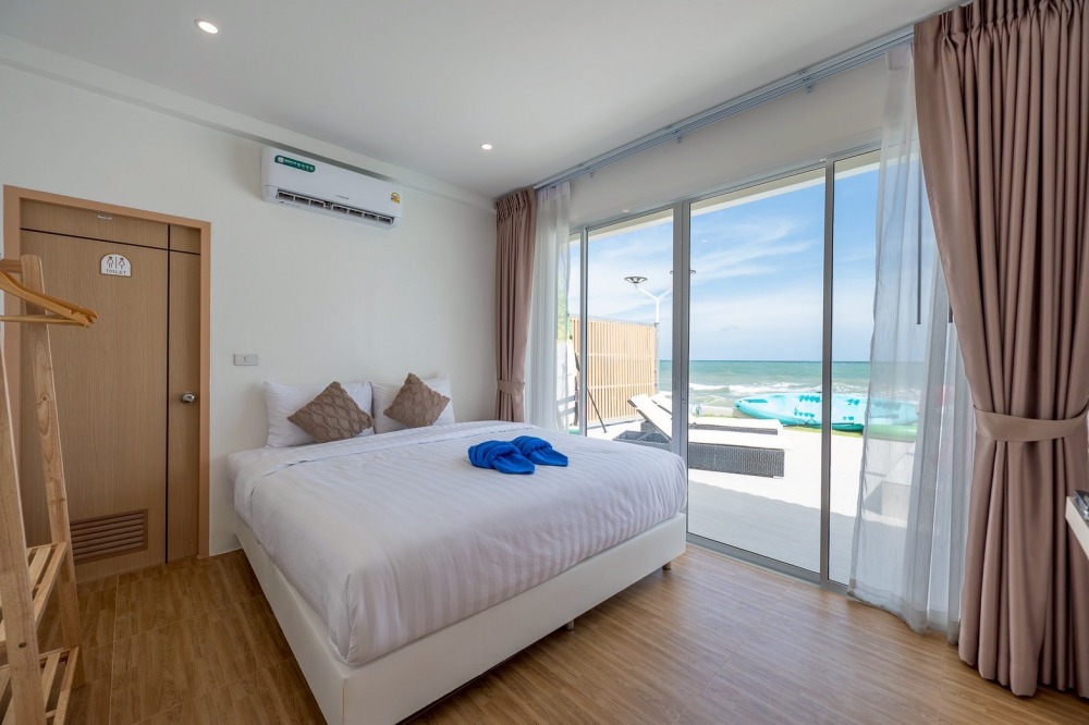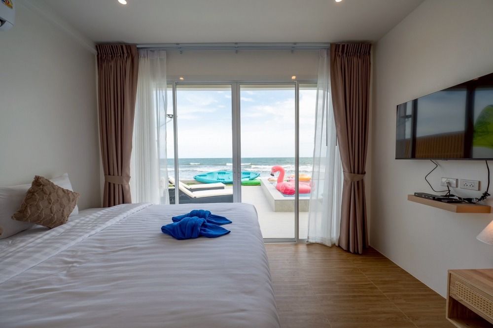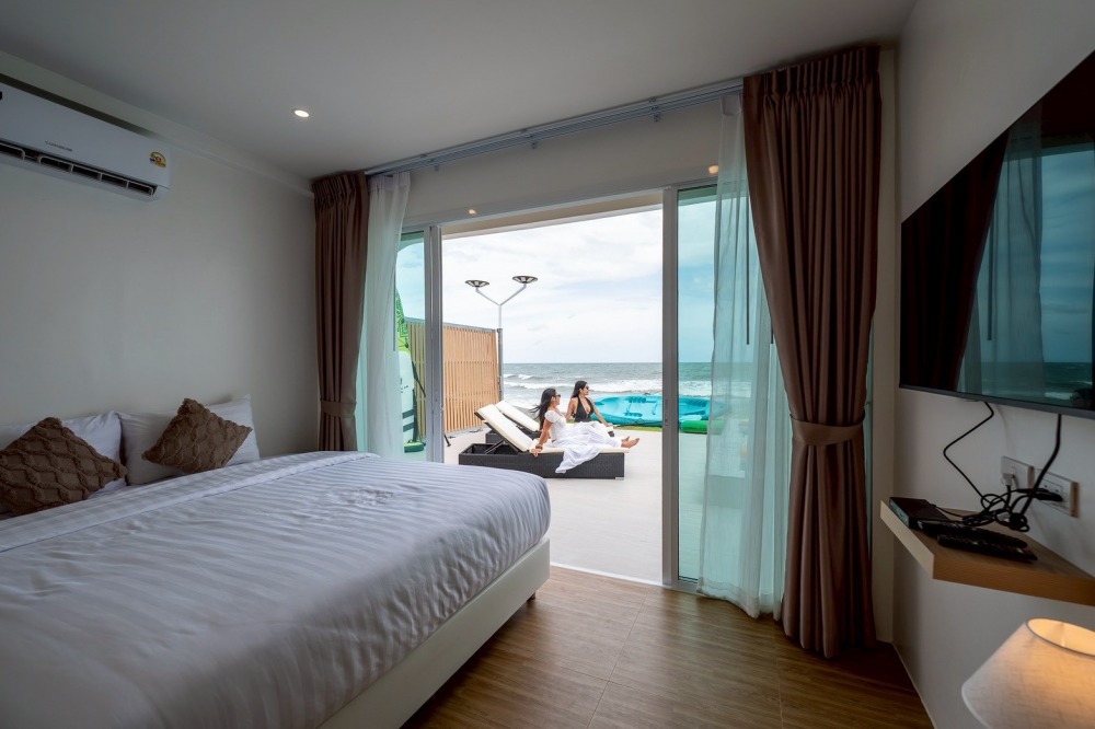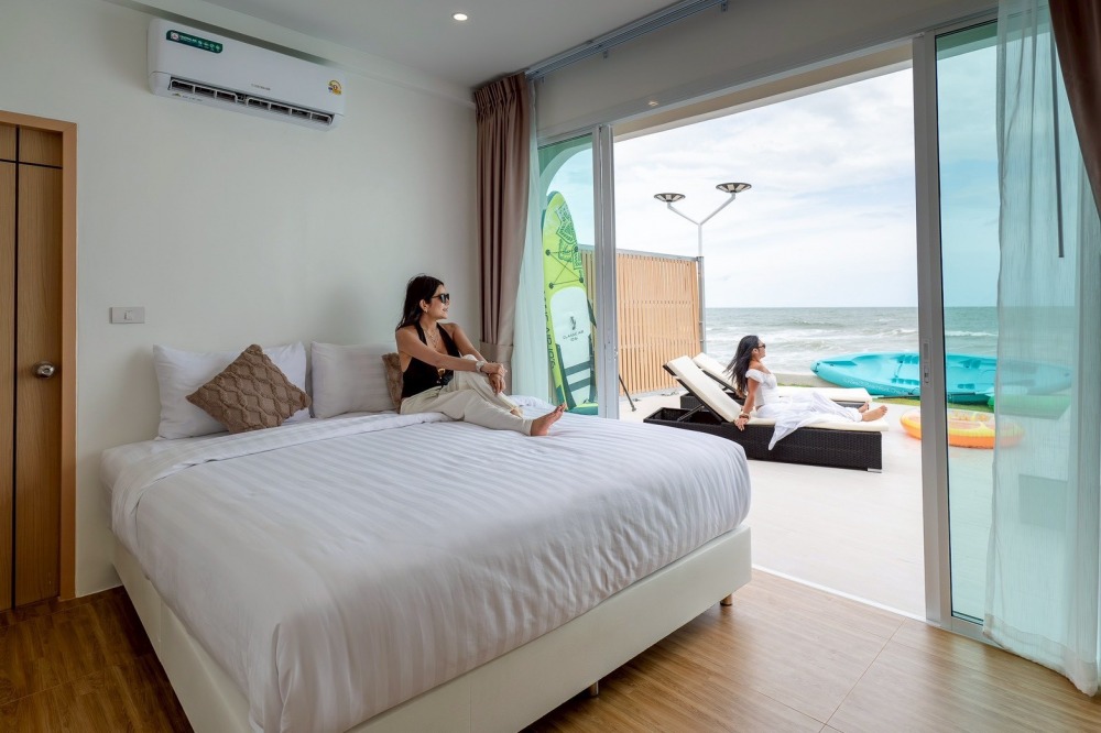 พลูวิลล่าชะอำ บรรยากาศดี ได้วิวริมทะเลมีพระอาทิตย์ขึ้น หน้าบ้านเป็นหาดทราย (หาดบางเกตุชะอำ ใกล้สะพานปูชัก)